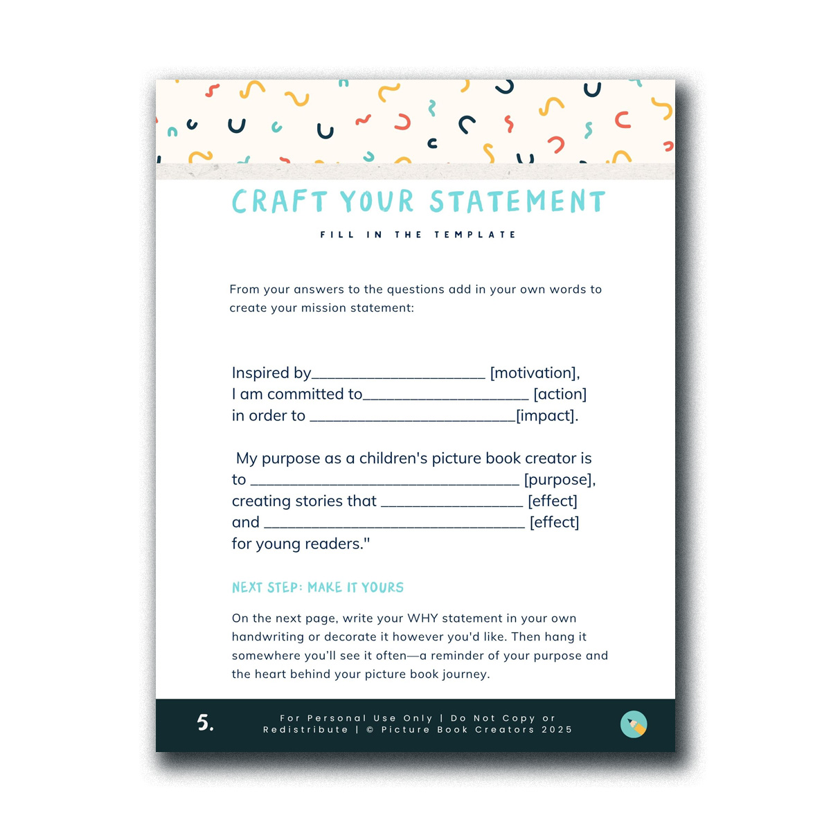 The WHY Guide is a printable template that helps you reflect, write, and shape your mission as a picture book creator. Whether you're just starting out or circling back to realign, this tool helps you lead with intention.